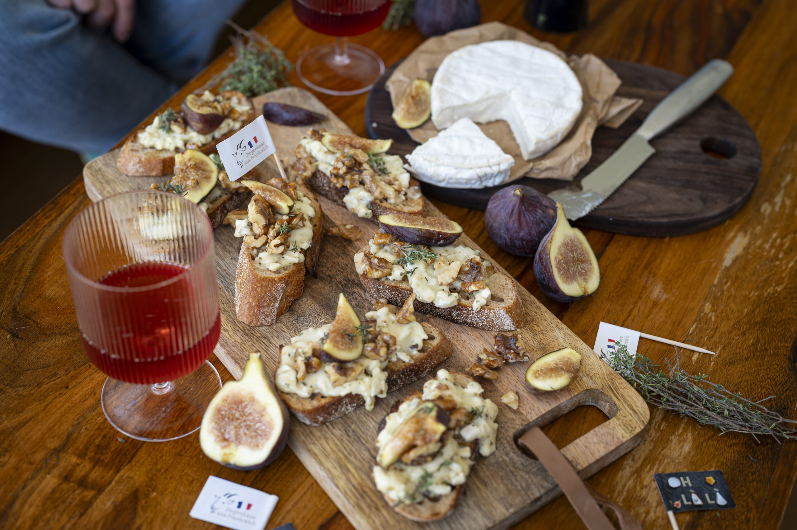 Die Baguettes auf ein Brett legen, mit der Camembert Creme bestreichen und jeweils eine Feigenspalte darauf geben. Karamellisierte Walnüsse darauf legen und mit Thymian bestreuen.