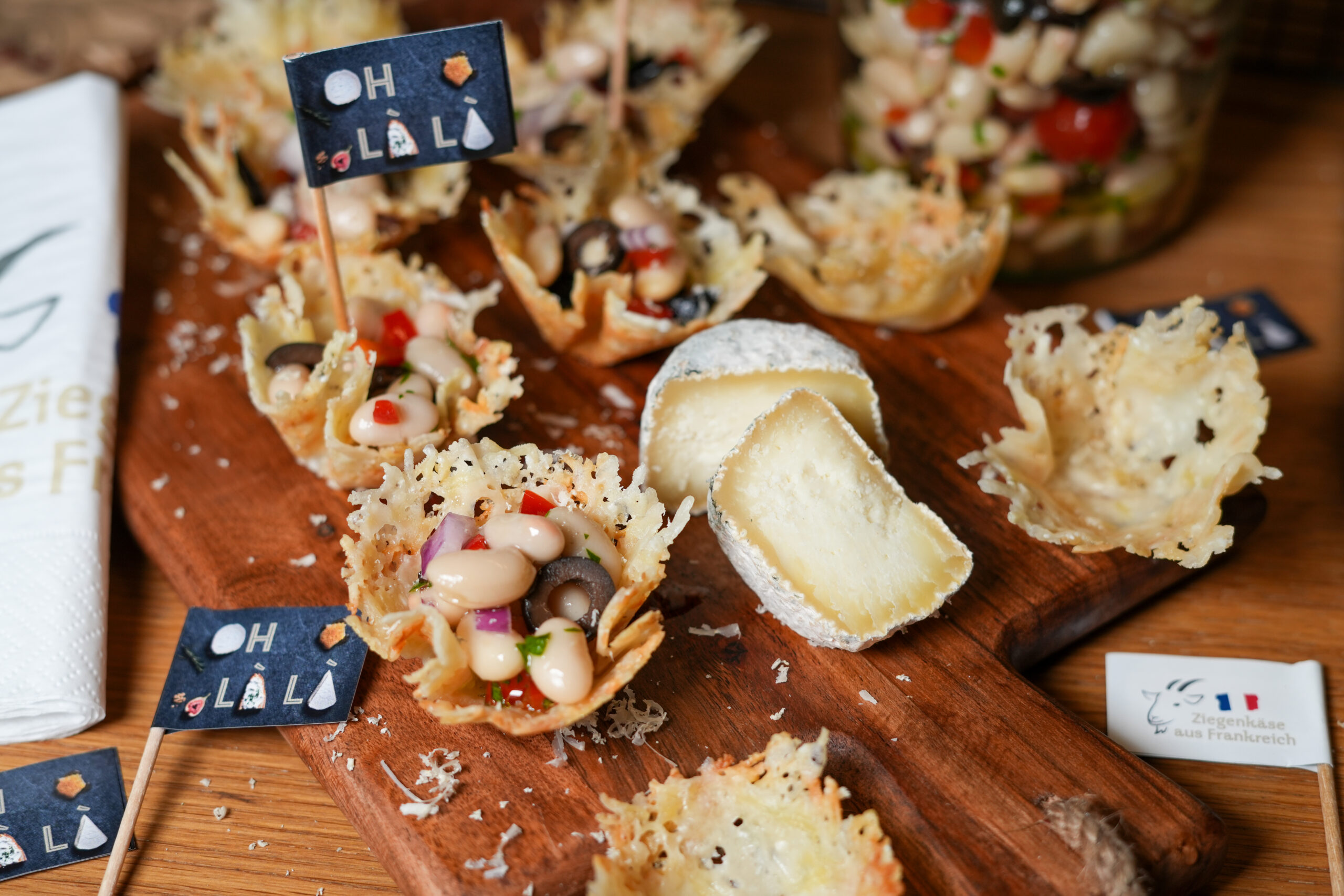 6. Zitrone pressen und aus dem Saft, Olivenöl, Salz, Pfeffer und Zucker ein Dressing rühren. Zusammen mit den Bohnen, dem Gemüse, den Oliven und den Kräutern in einer Schüssel vermischen, in den Chavignol-Häppchen anrichten und direkt servieren.