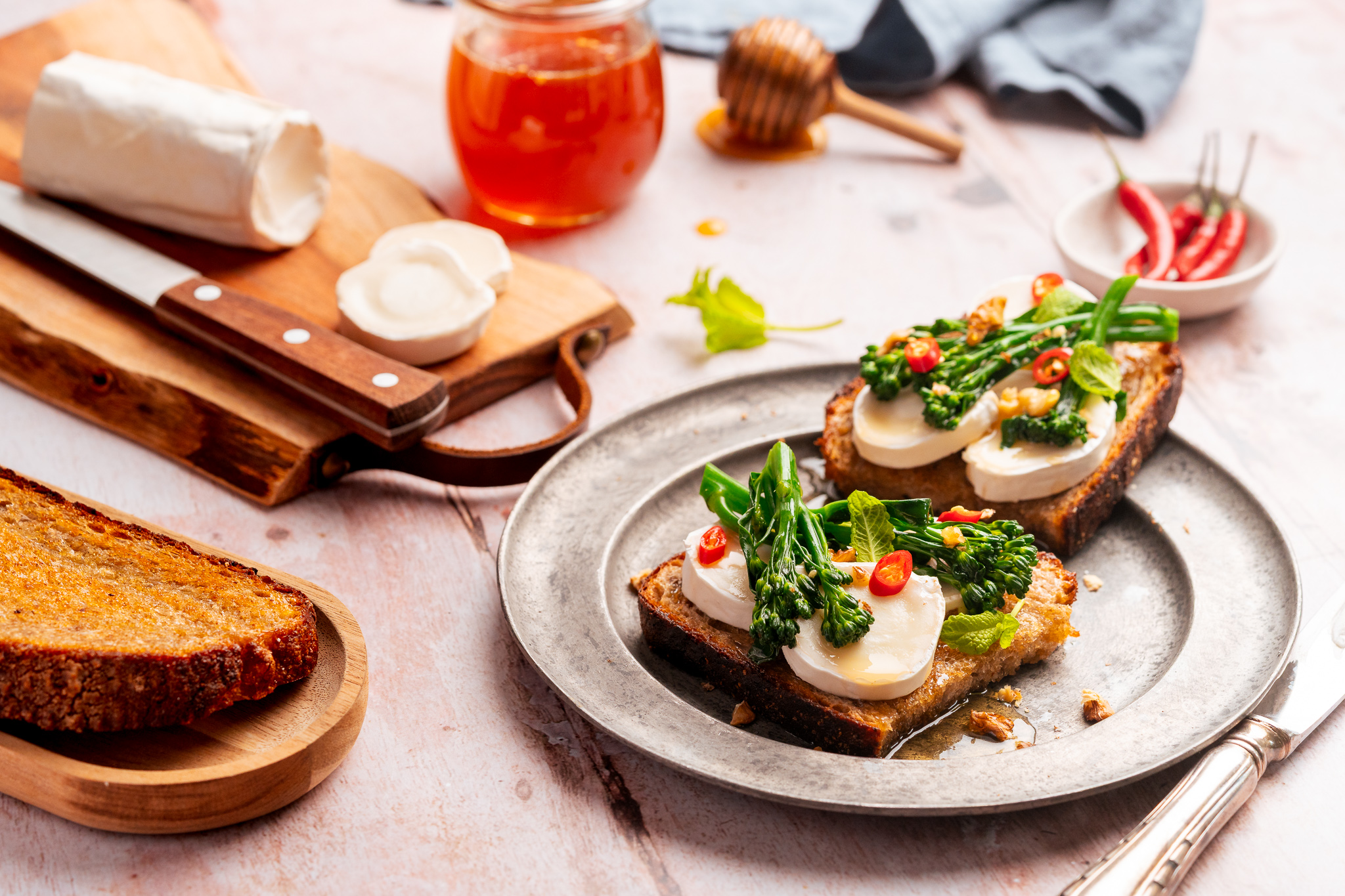 mit kleiner gereifter Ziegenkäserolle, wildem Brokkoli & Hot Honey