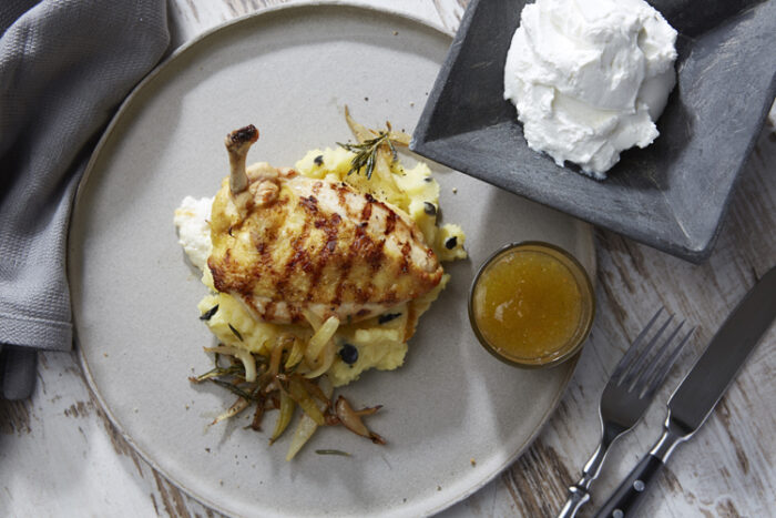 Gefüllte gegrillte Poulardenbrust auf Kartoffel-Oliven-Stampf