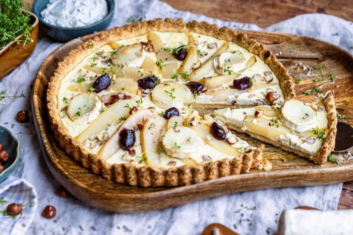 Französische Ziegenfrischkäse-Birnen-Tarte mit Feigensenf
