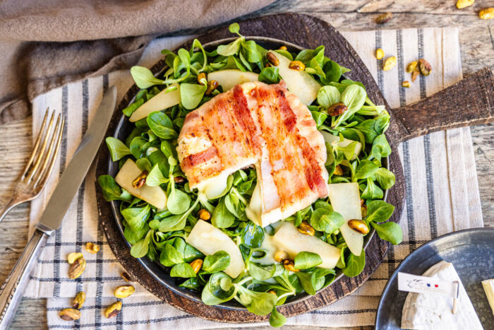 Ziegencamembert aus Frankreich im Speckmantel auf Birnen-Rapunzel-Salat